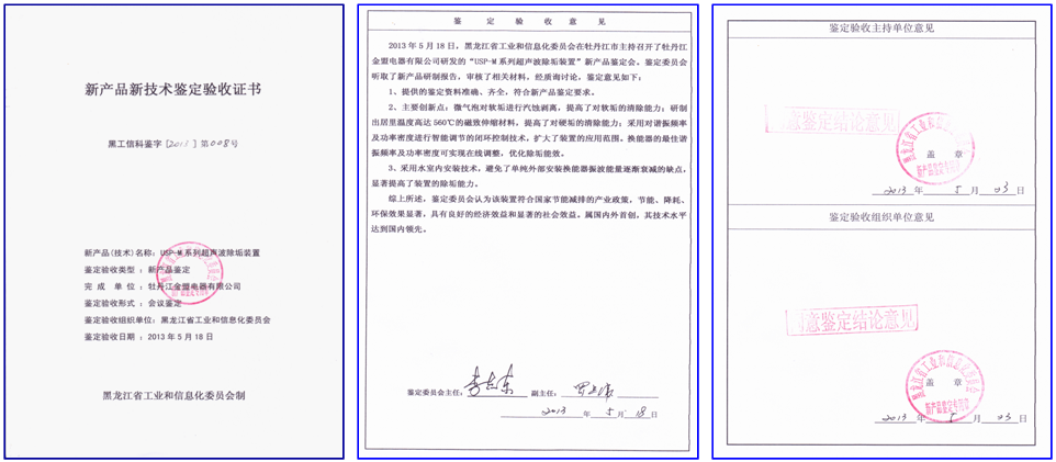 2013年5月,由黑龍江省工信委科技處組織,對(duì)USP-M系列超聲波除垢裝置進(jìn)行了新產(chǎn)品鑒定,鑒定結(jié)論:“屬?lài)?guó)內(nèi)外首創(chuàng),其技術(shù)水平達(dá)到國(guó)內(nèi)領(lǐng)先”。