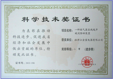 2010年,“一種凝汽器在線超聲波旋流除垢裝置”在電力系統(tǒng)200MW機(jī)組凝汽安裝使用,填補(bǔ)了國(guó)內(nèi)空白,該項(xiàng)目2012年獲得黑龍江省人民政府 “科學(xué)技術(shù)二等獎(jiǎng)”,2013年,獲得國(guó)內(nèi)“首臺(tái)套獎(jiǎng)勵(lì)”。